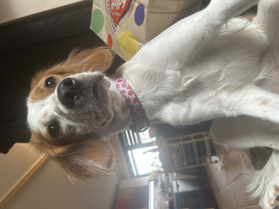 A white and reddish-brown patterned dog, consistent with a Spaniel breed, is depicted in a seated or reclining posture indoors. The dog wears a light pink collar decorated with strawberry patterns and is looking slightly upwards and to the right of the frame. Its fur is white with distinct reddish-brown patches on its head, ears, and around its eyes. To the dog's right, a light brown paper bag with multi-colored polka dots (red, green, yellow, purple) and partial text, including "Burger," is visible, suggesting a fast-food container. The background on the left is a blurred view of a kitchen or dining area featuring dark countertops, stainless steel appliances, overhead strip lighting, a bright window, and a light-colored wooden stool or shelf unit. The background to the immediate right and behind the dog is a dark, indistinct surface, likely furniture. The scene is illuminated by natural light entering from the left, indicating an indoor residential location in Unknown, Unknown. No other individuals or active interactions are present.