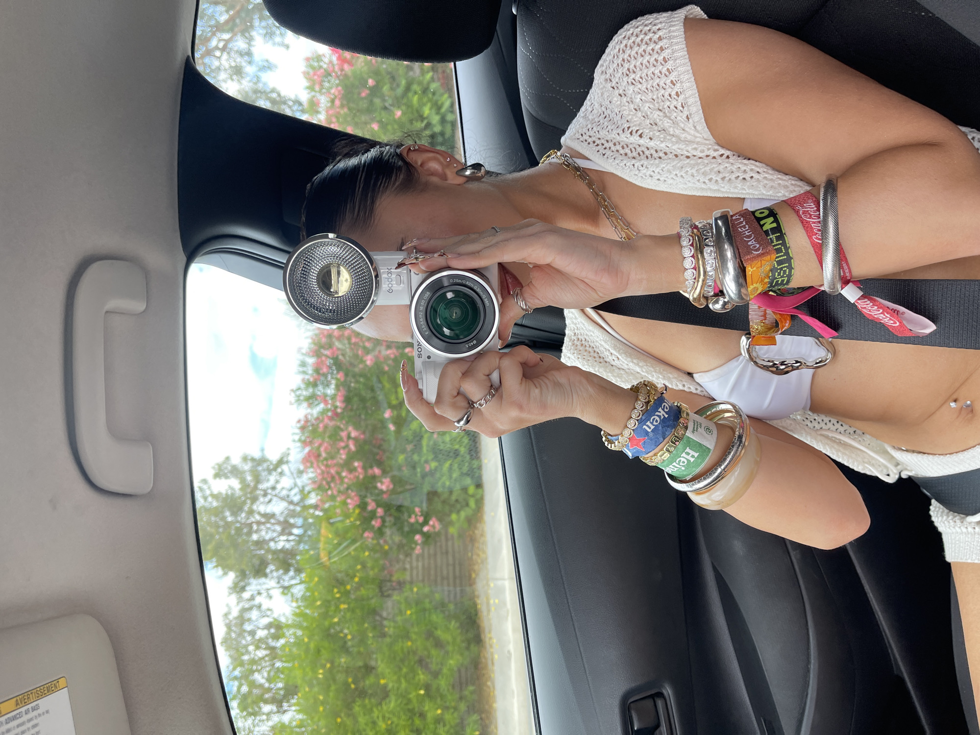Here is a forensic description of the image: A woman is positioned in the passenger seat of a car, oriented towards the camera. She is holding a white digital camera with a flash attachment up to take a picture. She has multiple bracelets on both arms, including what appear to be Coachella wristbands, and a Heineken branded wristband. Her clothing includes a white top or bikini top, a white crocheted sweater, and a visible gold chain necklace. The car is positioned to have green shrubbery and flowers visible through the car windows. The inside of the car is visible including a seat belt, a window control switch, a sun visor, and a grab handle. The text printed on her wristbands mentions Coachella, suggesting the woman has visited the festival in Indio, California. A “Coca-Cola” branded wristband is also visible, the exact nature and location are currently unable to be determined based on this information.