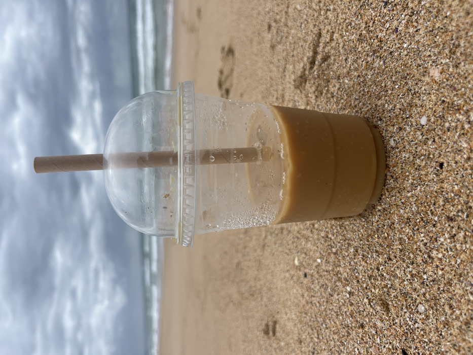 - "A clear plastic cup filled with a light brown beverage sits on a sandy beach" by FM-R1zri2, licensed under CC BY 4.0