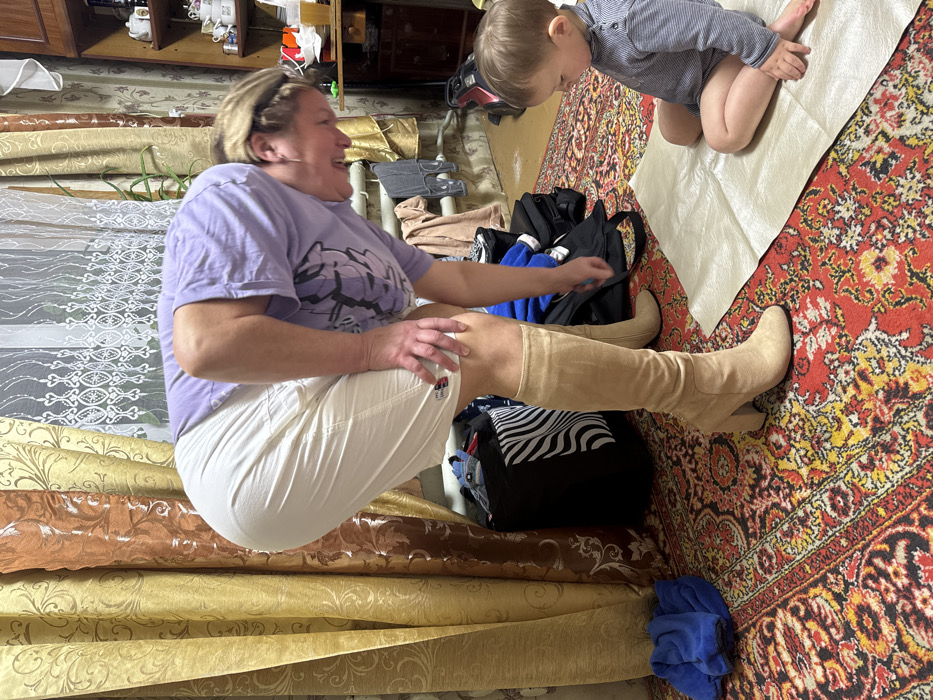 A woman is squatting with light beige, heeled boots on, wearing white pants and a purple t-shirt. She's surrounded by rolls of fabric in golds, browns, and whites. A small child is on a cream-colored and red patterned rug. There are clothes and bags on the rug near the woman. The scene appears to be indoors with visible storage in the background. The woman is turned to the side, smiling.
