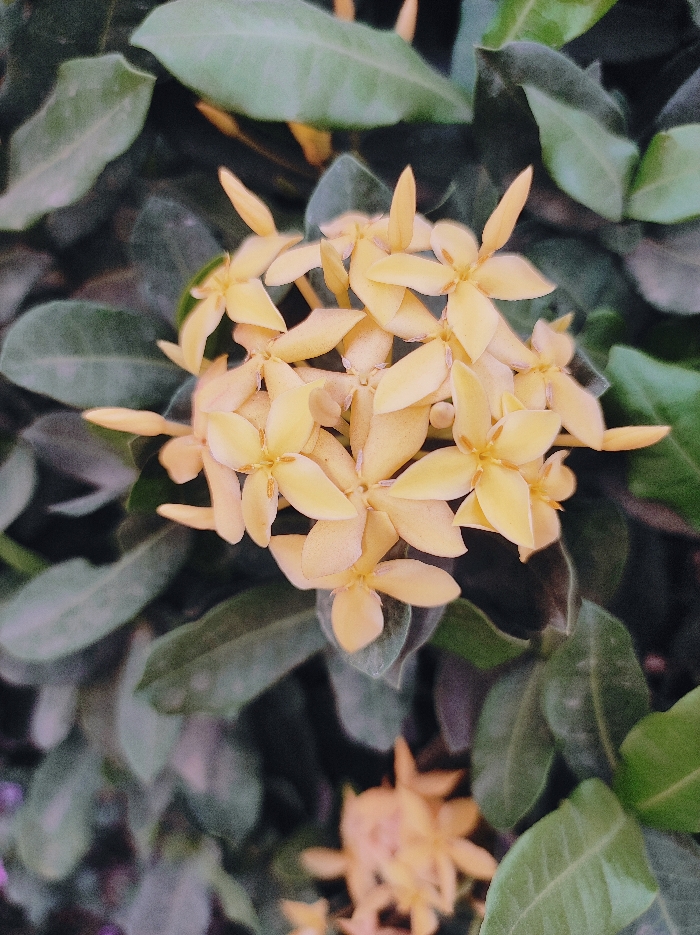 - "Clusters of petite, pale yellow Ixora flowers bloom amidst a backdrop of lush green foliage" by FM-HInS92, licensed under CC BY 4.0