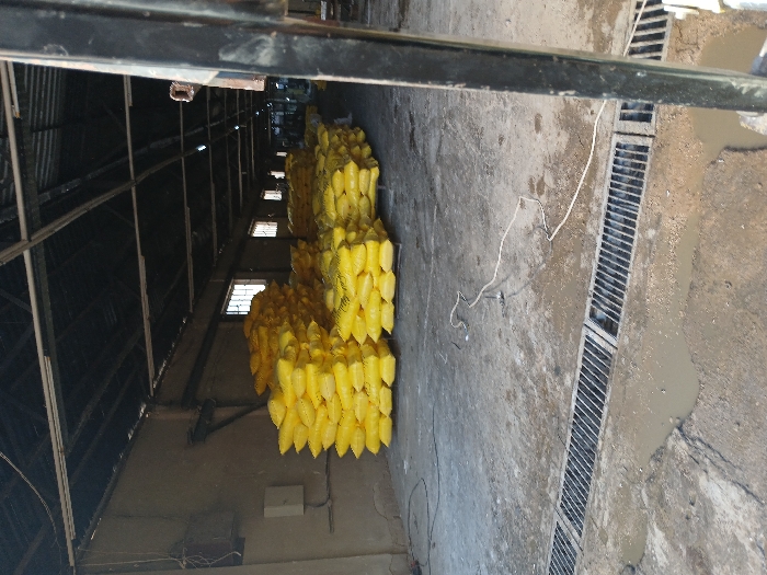 The scene depicts the interior of a large industrial warehouse or storage facility located in As-Sabina, Syria. The concrete floor exhibits significant wear, grime, and localized puddles of standing water, with a prominent linear drainage grate system running horizontally across the foreground. A white electrical cord or similar cable is loosely laid on the floor, extending from the left. The central and background areas are dominated by numerous organized stacks of uniformly yellow-colored sacks or bags, arranged in multiple rows that extend into the distance. A white electrical box is mounted on the left concrete wall. The building features a high ceiling with exposed dark metal support beams and a dark roof structure. Multiple rectangular windows are visible high on the far wall, providing ambient light. A dark, vertical metal beam partially frames the right side of the image. No individuals are present within the frame, and no specific actions or interactions are observed.