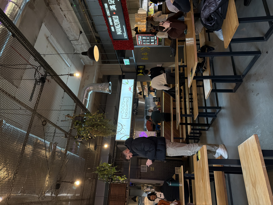 The image depicts an indoor food hall located in Kampus, Manchester, United Kingdom