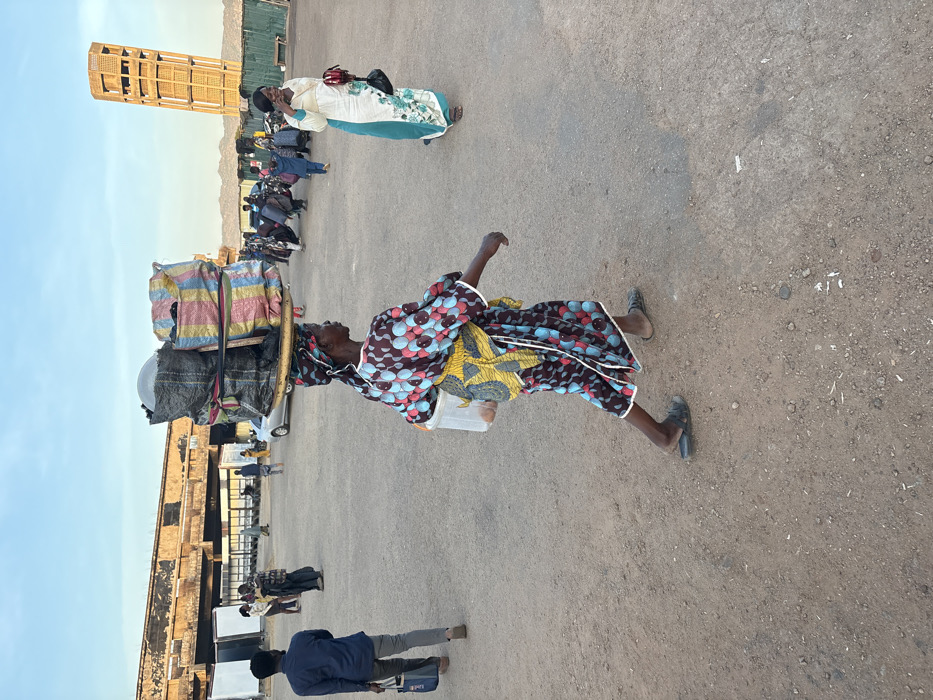 This image depicts a bustling outdoor scene at the Jos Terminus Market in Jos, Plateau State, Nigeria, during daylight hours. In the immediate foreground, a dark-skinned woman is captured in profile, walking from right to left. She carries a substantial, complex load on her head, consisting of several bundled sacks (including black, striped, and multi-colored varieties) secured to a round, flat board. She wears a patterned long dress featuring blue, red, and white circular motifs on a dark background, a matching headwrap, a yellow fabric tied around her waist, and dark slides on her feet. Her left hand holds a translucent plastic container. To the right, a second dark-skinned woman walks towards the viewer, holding a mobile phone to her right ear and smiling. She is dressed in a light-colored, long-sleeved dress with green accents and carries a black shoulder bag with a red flap. To the left, a dark-skinned man walks away from the camera, carrying a blue bag in his left hand. The midground reveals a wide, open expanse of dry, unpaved ground, populated by numerous other individuals, many appearing to carry luggage or goods, suggesting a transportation hub or market activity. A silver car is visible parked among the distant crowd. The background features significant architectural elements. To the left, a large, dark, weathered horizontal structure, possibly a former railway bridge or overhead platform, dominates the skyline, with white panels visible beneath it. To the far right, the iconic, brown, multi-tiered Jos Terminus Market Clock Tower, notable for its distinct lean, stands prominently against a clear, light blue sky. Beyond the market area, low, light-colored mounds or distant terrain are visible.
