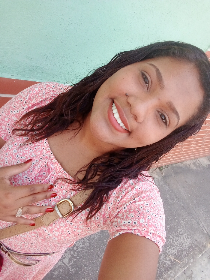 A woman smiles at the camera, hand on her chest. She wears a pink floral dress and a tan belt with a gold buckle. Her fingernails are painted red. She has brown hair and is wearing a ring on her left ring finger. The background shows a light green and red wall, with a gray floor.