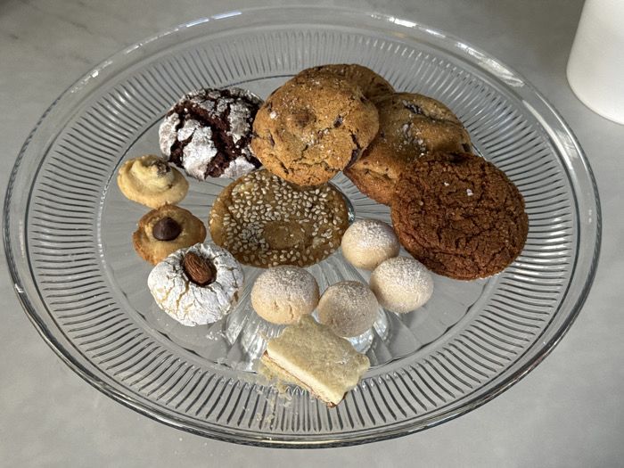 A clear glass serving plate, approximately 30 cm in diameter with a ribbed perimeter, is positioned centrally on a light gray countertop or table surface in Palmetto Bay, United States. The plate holds an assortment of approximately 16 distinct baked goods. From left to right, prominent items include two dark brown chocolate crinkle cookies dusted with powdered sugar, a small light-brown rolled pastry, and a small cookie with a single chocolate chip. Towards the center, a golden-brown sesame seed cookie is visible alongside a white, powdered sugar-dusted almond cookie. To the right, two larger golden-brown chocolate chip cookies with visible sea salt flakes are present. A large, dark brown, textured cookie, also sprinkled with sea salt, rests below them. Five smaller, light-colored, spherical cookies are dispersed in the lower-right quadrant. A broken rectangular bar cookie, revealing a light crust and a reddish-pink filling, lies at the bottom center. A white, cylindrical object is partially visible in the out-of-focus background, upper right. No individuals are present, and no actions or interactions are depicted.