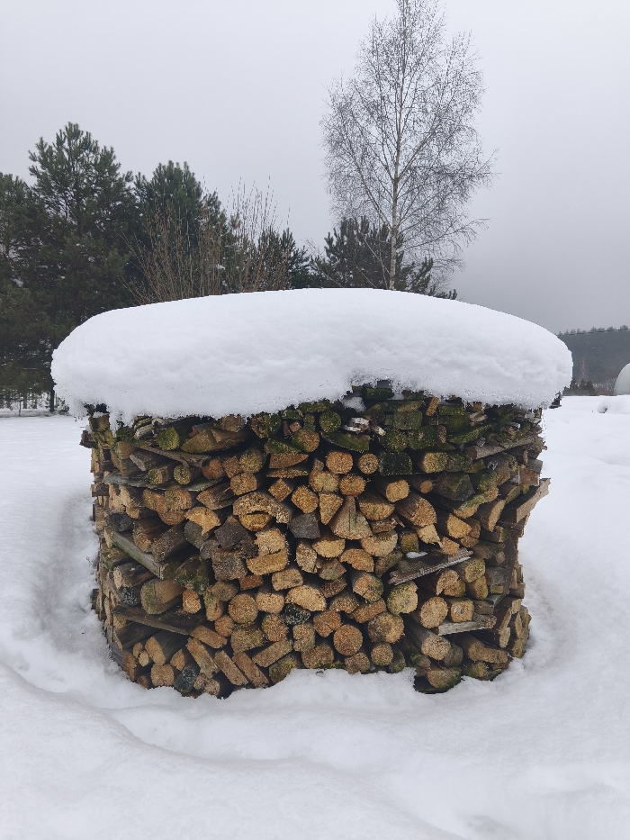 A large, cylindrical stack of cut firewood, approximately 1.5 meters in height, is centrally positioned in a snow-covered outdoor area in Парэчча, Belarus. The top surface of the firewood stack is covered by a thick, rounded layer of undisturbed white snow. The exposed sides of the stack display numerous split and cut wood pieces of varying sizes and shapes, predominantly light brown to dark brown, with some pieces exhibiting green lichen or moss. Fine wood particulate matter is visible on several cut surfaces. The ground immediately surrounding the stack is covered in a uniform layer of white snow. In the background, to the left, a dense cluster of dark green coniferous trees is visible. To the right, a tall, bare deciduous tree with a light trunk and fine branches stands against an overcast, light grey sky. Further in the background, a distant tree line is visible. No individuals or objects other than the natural environment and the firewood stack are present.