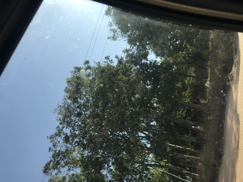 The image presents an outdoor scene, presumably in the city of Wang, Nigeria, viewed from the interior of a vehicle through a window. The window exhibits multiple white circular smudges and a prominent sun glare in the upper right quadrant. The upper half of the frame features a clear, light blue sky. Below the sky, a dense line of trees with green foliage occupies the middle ground, extending across the image. Multiple dark, horizontal utility lines traverse through the upper section of the tree canopy. The foreground consists of a dirt road or track, lined with dry, sparse grass and low-lying vegetation. No individuals, animals, or specific structures are discernable.