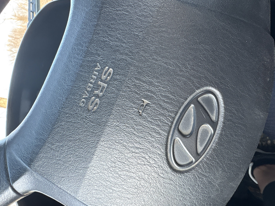 The scene depicts the interior of a vehicle, specifically focusing on the dark grey, textured steering wheel, located in Lozen, Bulgaria. The central hub of the steering wheel features a silver-colored Hyundai logo. Above the logo, a small silver horn symbol is present. Further above and inverted, the text "SRS AIRBAG" is embossed in silver. A partial view of a person's left foot, wearing a dark shoe with a white sole, is visible in the lower-left corner of the frame. Through the windshield in the background, out-of-focus bare tree branches are discernible against a bright sky, indicating an outdoor, daytime setting. No specific actions or interactions are occurring within the visible frame.