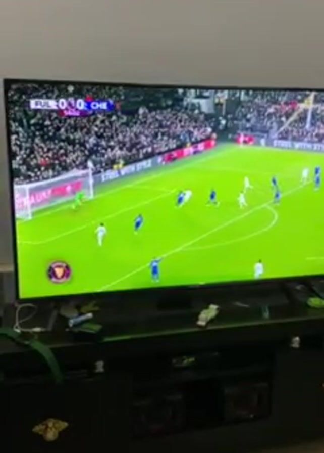 A television displaying a soccer game is shown on a black entertainment center. The screen shows the score as Fulham 0, Chelsea 0. At this moment, a player in a white jersey scored a goal and runs past the camera. The jersey says RAUL, and number 7. In the background, the stands are filled with people. The entertainment center is cluttered with various items including a vape, a lighter, and other small objects. The room is brightly lit, but only the wall behind the TV is visible.