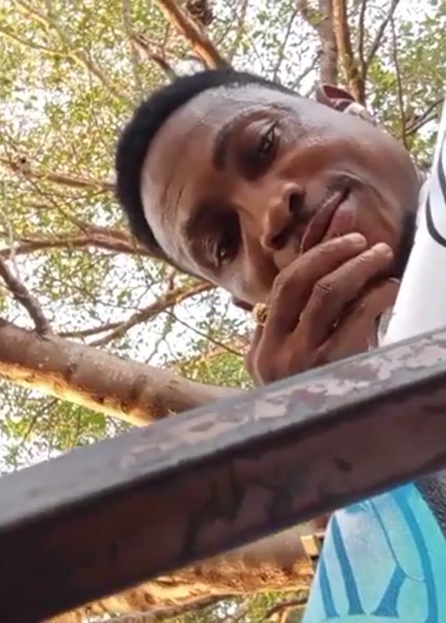 A man wearing a white shirt with a large design on the front is standing behind a metal railing. He is looking up at the camera and speaking. Behind him is a tree with bare branches. The sky is visible through the branches. The man touches his face and makes gestures as he speaks. He seems to be outdoors.