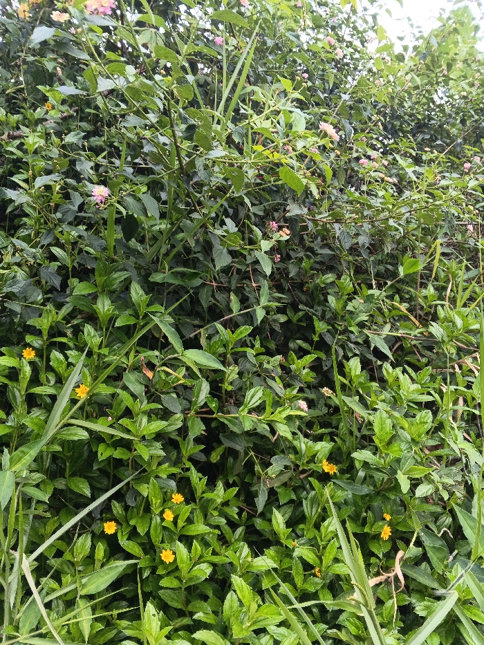 The image displays a dense arrangement of tropical vegetation, consistent with natural or uncultivated areas found within Đà Nẵng, Vietnam, though specific landmarks for precise location identification are absent. The scene is dominated by various shades of green foliage. In the upper and mid-ground, a prominent shrub exhibits numerous clusters of small, pink and light purple flowers. In the foreground and lower mid-ground, smaller plants with bright green leaves are interspersed with multiple small, vibrant yellow, daisy-like flowers. Tall blades of green grass are visible, particularly on the left side and extending towards the center-right. No individuals, animals, or man-made structures are present within the frame. The lighting is natural, indicating diffuse daylight conditions.