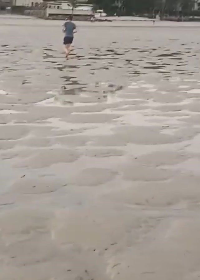 A single person wearing a dark blue or black t-shirt and dark shorts is jogging away from the camera on a wide, wet beach