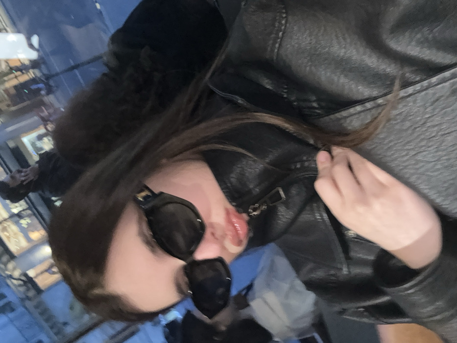 The image displays a close-up, vertical shot of a female subject, likely a selfie, centered in the frame. The subject has long, dark brown hair and is wearing large, black, cat-eye style sunglasses with gold-colored accents on the temples. Her lips are glossy. She is dressed in a black leather jacket featuring a high collar and a visible metal zipper pull. Her right hand is partially visible, touching a strand of her hair near her chest. The background is a blurred reflection, indicating the subject is positioned in front of a glass panel or window overlooking an urban environment. Visible in the reflection, located in the upper right quadrant, is a male figure with dark hair and a beard, holding a dark object, likely a phone, to his ear. Another blurred figure in a white garment is partially visible on the left. The reflections also show indistinct building facades and ambient light sources, suggesting an evening or nighttime setting on a city street in Paris, France.