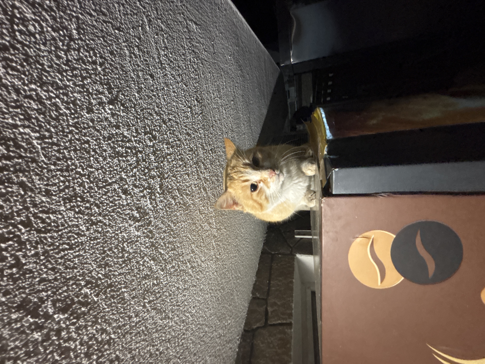 An eye-level, indoor shot shows an orange and white cat looking at the camera, next to a textured wall and a brown box with a coffee bean logo