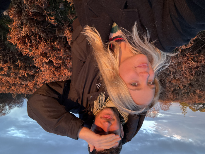 The image depicts two individuals in an open, natural area within the city of Stafford, United Kingdom, during late afternoon or early morning golden hour light. In the foreground, a young adult female with blonde hair and a light complexion faces the camera, exhibiting a slight smile. She wears a dark overcoat over a multi-colored striped sweater, with golden light illuminating her right side. Behind her, partially obscured, stands a young adult male with dark hair and a beard. He wears a dark winter jacket with a light-colored striped scarf. His right hand is raised to shield his eyes, indicating he is looking towards a low sun source to the left of the frame. The background consists of a field of dried, reddish-brown bracken or similar foliage, brightly illuminated by the golden light. Beyond the foliage, a line of trees, including both deciduous and evergreen species, is visible against a sky featuring a mix of dark clouds and lighter patches.
