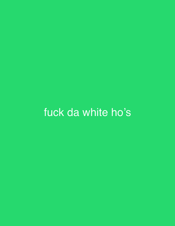 At a location in the city of Byala Reka, Bulgaria, an image is displayed. This image features white, sans-serif text centered horizontally and vertically against a solid, vibrant green background. The text reads: 'fuck da white ho's'. No individuals, discernible objects other than the text, actions, interactions, or additional environmental details are present within the image frame.