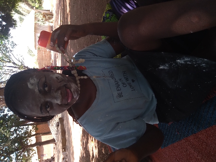 A young female subject is depicted seated outdoors in Godogodo, Nigeria. Her complexion is dark, and her braided hair is partially adorned with colorful beads. Her face, neck, and torso are covered with a white powdery substance, which also features a dark, heart-shaped marking on her right cheek. She looks directly at the camera with a slight smile, her tongue extended. She is wearing a light blue short-sleeved t-shirt with the printed text "BE ENAMORED OR IN LOVE WITH" and dark-colored shorts, both of which show residual white powder. A white beaded necklace with colorful accents is visible around her neck. In her right hand, she holds a clear plastic container with an orange lid, containing a white substance. The subject is seated on a mat exhibiting blue and red striped patterns. The background features an unpaved ground surface and several single-story structures constructed from materials resembling reddish brick or mud, some with white finishes, along with mature trees under natural daylight.