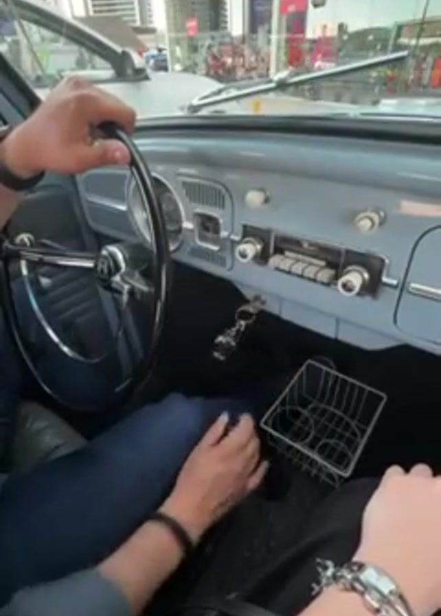 From the driver's seat of a vintage car, the scene shows a man in a grey shirt and jeans turning the ignition key. He is wearing a black bracelet on his left wrist. The car's dashboard is light blue with a silver steering wheel, a speedometer, and a vintage radio. A white wire basket sits on the floor, holding small items. To the right of the frame, another person is visible, wearing a black top and multiple bracelets. The car appears to be at a gas station, with the station's signage and a tall building visible through the windshield. The car starts and the engine turns over.