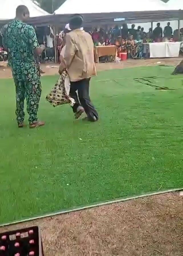 two men dancing on a green field in front of a crowd of people. The first man is wearing a camouflage outfit, and the second man is wearing a brown jacket and dark pants and carrying a bag. There are tents set up in the background. There are also cases of bottled drinks and an empty green bottle in the foreground. The man in the brown jacket takes off his jacket and continues to dance.