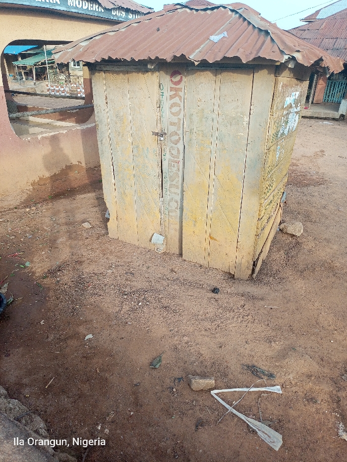 small wooden shack with a corrugated metal roof, located in Ila Orangun, Nigeria