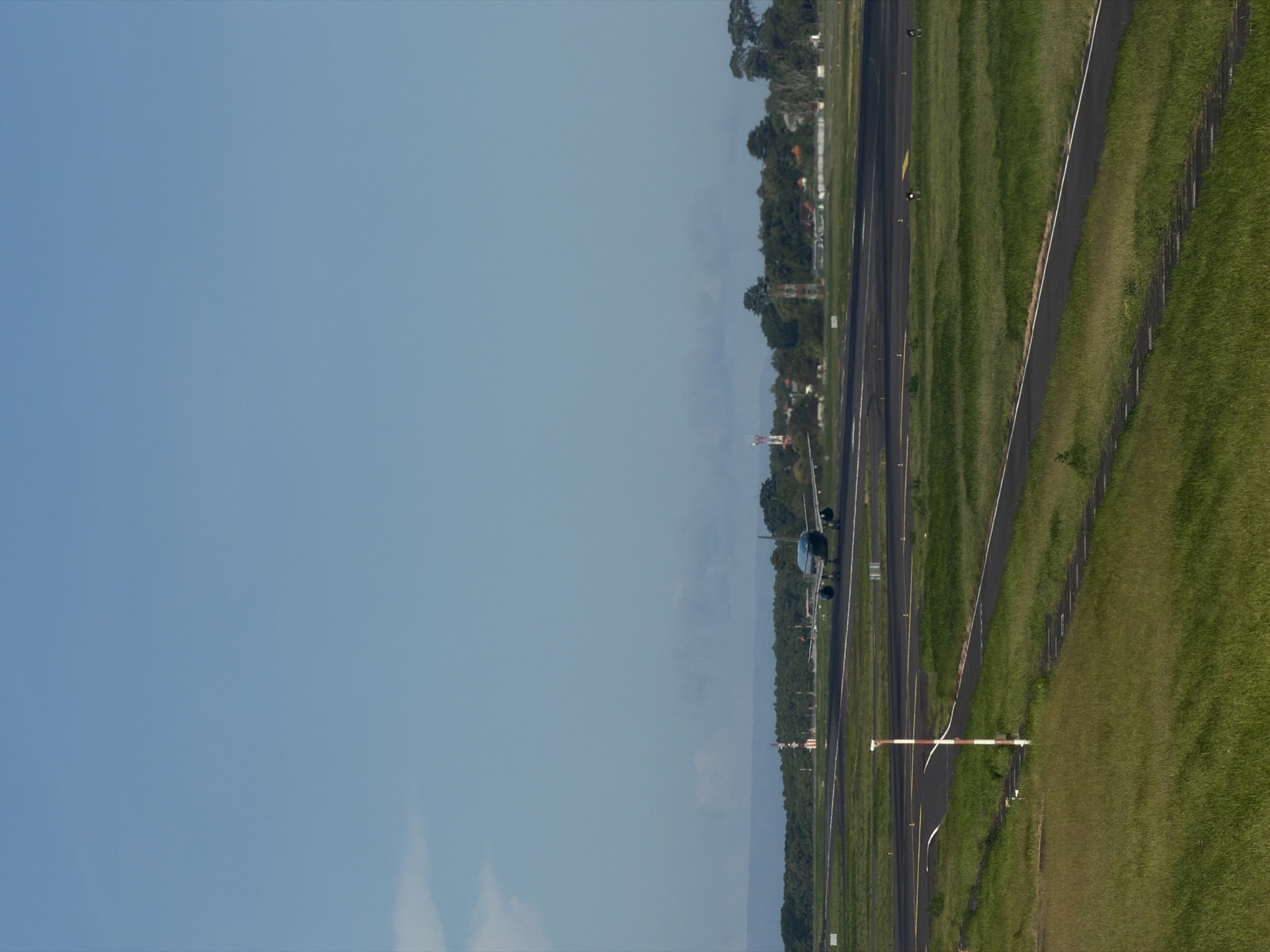 A medium-angle shot depicts an airplane about to land on a runway, with a clear blue sky taking up the upper left of the frame. The runway stretches from bottom to top, flanked on either side by green grass and a line of trees in the background. A red and white striped windsock is visible in the foreground, near the bottom of the frame. The location is Kuta, Indonesia.