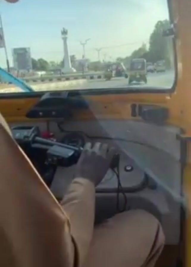 view from inside a yellow auto rickshaw as it travels on a paved road. The driver, wearing a tan outfit, is visible, gripping the handlebars of the vehicle. Through the windshield, a roundabout with a tall monument in the center can be seen, along with other similar vehicles and streetlights. The sky is blue and the light suggests it's daytime.