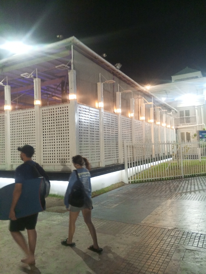 A nighttime scene shows a man and a woman walking on a paved sidewalk. The man carries a blue surf board. They are alongside a large white building with a lattice facade and numerous lights hanging from above. A white fence separates the building from a grassy area. The sky is dark.