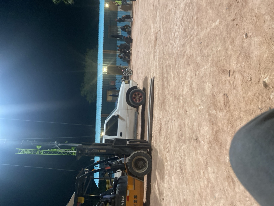 This night-time outdoor scene, located in Zhongshan, China, depicts an unpaved, reddish-brown dirt lot illuminated by artificial light sources. In the immediate foreground, the top of a person's left thigh, clad in dark pants, is visible. In the left mid-ground, a yellow and black forklift (bearing the number '4352' and Chinese characters '叉车') is parked, facing slightly right with its forks extended and resting on the ground. A tall, green-lit mast structure extends vertically from or immediately behind the forklift's mast. Directly behind the forklift's forks, a white pickup truck with a red front-left wheel rim is parked, facing left. Further to the right, a motorcycle is parked near a long, low building with a light blue corrugated metal roof and walls resembling modular units or shipping containers, featuring illuminated openings. Along the front of this building, a group of approximately 10-15 individuals, predominantly dressed in dark attire, are gathered, mostly seated or squatting on the ground. One person on the far right stands, wearing a light-colored vest. Trees are visible in the distant background, silhouetted against the dark sky. Overhead lines traverse the sky in the upper left.