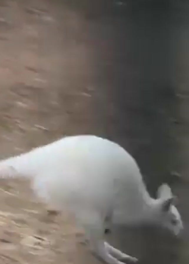 A video shows an albino kangaroo hopping around a dirt enclosure
