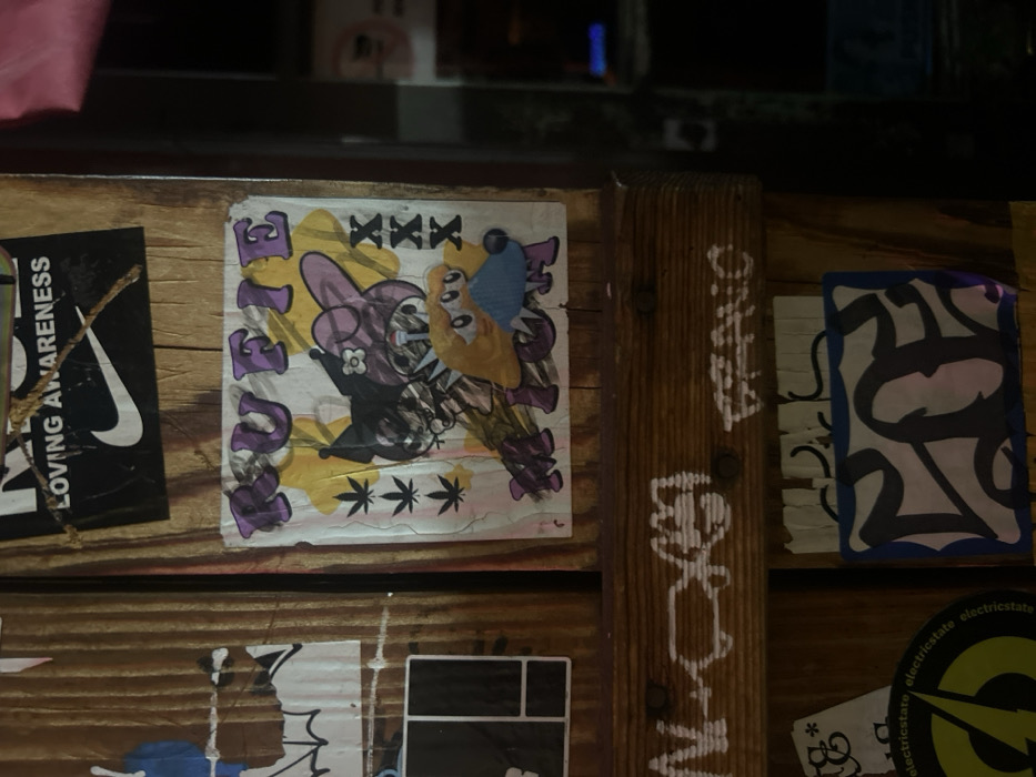 The image displays a vertical section of a worn wooden surface, likely a wall or structural beam, heavily adorned with layered stickers and graffiti. The scene is dimly lit. **Central Subject (Sticker):** A prominent, distressed sticker occupies the center. It features a chaotic arrangement of cartoon characters on a faded yellow and white background. A black, pointy-eared character with a skull emblem and an "X" over one eye is depicted alongside a pink, bunny-eared character with red markings on its head. A blonde, human-like character holding a small blue object is also visible. The word "RUFIE" is displayed in purple block letters at the top. To the left, three green cannabis leaf symbols are stacked vertically, while three "X" symbols are stacked vertically on the right. Partial purple text, possibly "MOM," is visible at the bottom. The sticker exhibits creases, tears, and discoloration from age and exposure. **Other Objects/Subjects:** * **Upper Section:** Above the central sticker, a black rectangular sticker bearing the white Nike swoosh logo and the text "LOVING AWARENESS" is visible, secured by a piece of twine. * **Left Side:** Several other stickers are partially visible, including a torn blue one and a black-and-white geometric design. * **Lower Section:** Below the central sticker, a horizontal wooden beam is marked with white graffiti scrawl, largely illegible. Further down on the left, a circular yellow and black sticker with a lightning bolt symbol and "electricstate.com" is present. On the right, a rectangular sticker with a blue border contains abstract black and purple lettering. **Environment:** The background consists of vertical wooden planks and horizontal beams, all appearing aged and textured, fastened with visible nails. This suggests an interior or semi-sheltered public space, such as a bar, club, or an establishment that permits public art. **Location:** The specific location within Los Angeles, United States of America, cannot be determined from the visual information provided in the image.