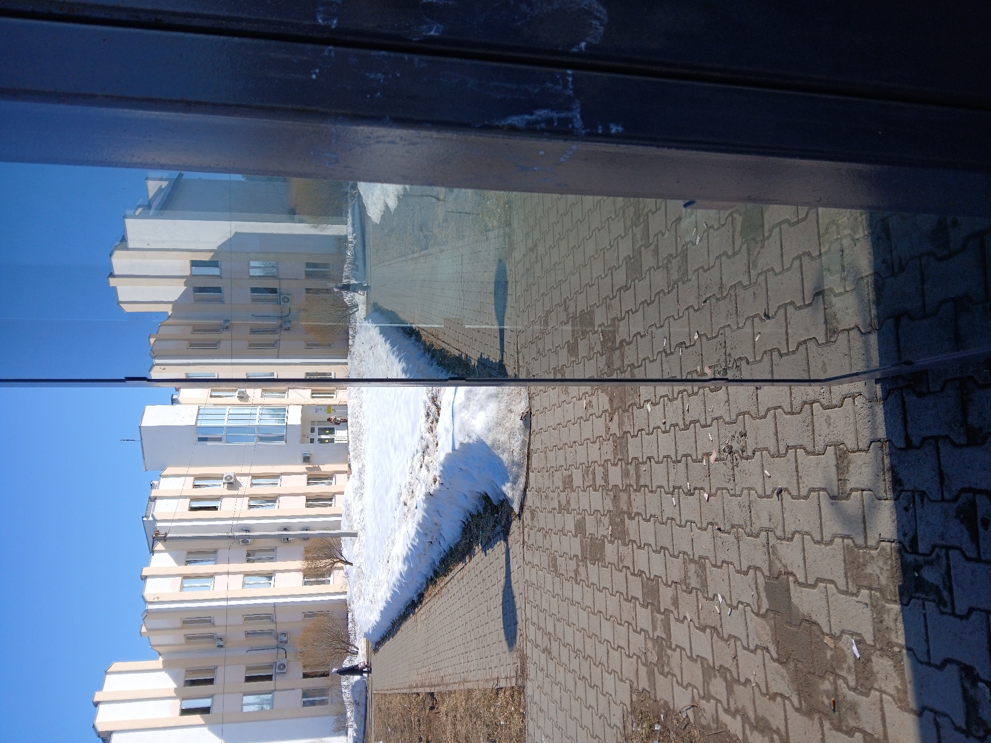 reflection of a building and sidewalk in a window. The building has multiple floors and appears to be residential. Patches of snow are visible along the sidewalk. The sidewalk is made of grey interlocking pavers. Based on the location, it could be in Chaikovsky, Russia. The photograph is taken indoors and the reflection is seen through a glass pane framed by dark metal.