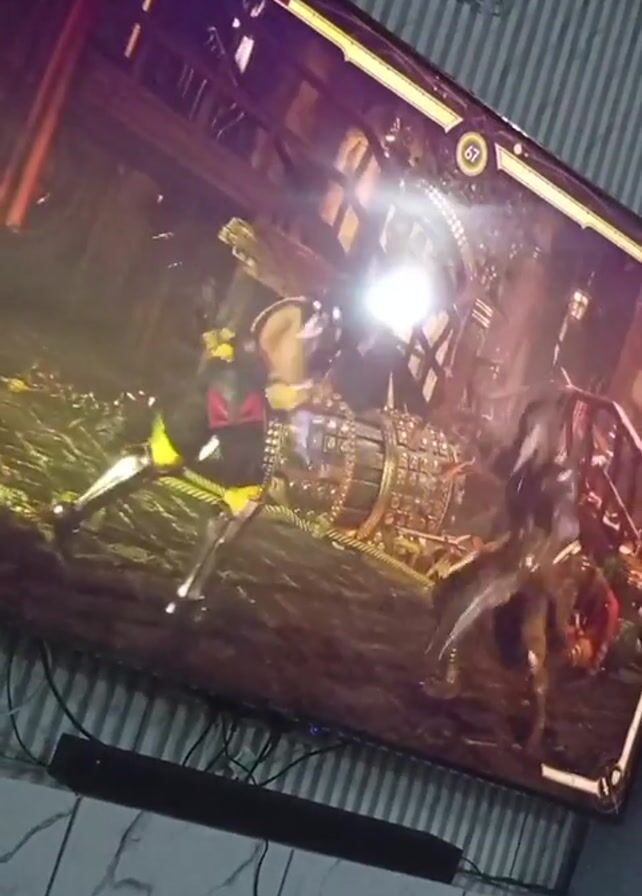 A video taken at an eye-level, angled perspective shows a television playing Mortal Kombat. Scorpion is in the midst of fighting his opponent. Scorpion is visible in a yellow and black outfit with two swords. He appears to be executing some sort of attack on his opponent. The screen is brightly lit due to the lights of the game. In the background, a white and gray patterned wall is visible. Below the television, a black soundbar rests on the same surface.