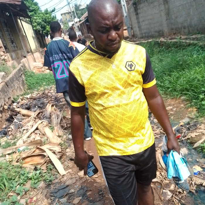 This outdoor scene, set in the city of Unknown, Unknown, depicts an unpaved, debris-laden thoroughfare. In the immediate foreground, a bald, dark-skinned adult male, perspiring, is observed walking towards the viewer's right with his gaze directed downwards. He is dressed in a yellow and black Wolverhampton Wanderers FC short-sleeved jersey and black shorts. His left hand grasps a dark smartphone displaying a blue and white pattern, while his right hand carries a pair of black and white sneakers and a light blue and white striped cloth. Behind him, two other individuals proceed away from the camera; the foremost wears a dark blue shirt with the partial inscription "RETHE T 20" in contrasting colors. The ground consists of exposed dirt, accumulated organic waste resembling dried plant matter, and various refuse. To the left, a low, damaged concrete barrier abuts a deteriorated building with a corrugated roof. The right side features a deep, grass-filled ditch. The background reveals additional residential structures of concrete construction and a network of overhead utility wires, indicative of an urban or peri-urban environment with visible environmental neglect.