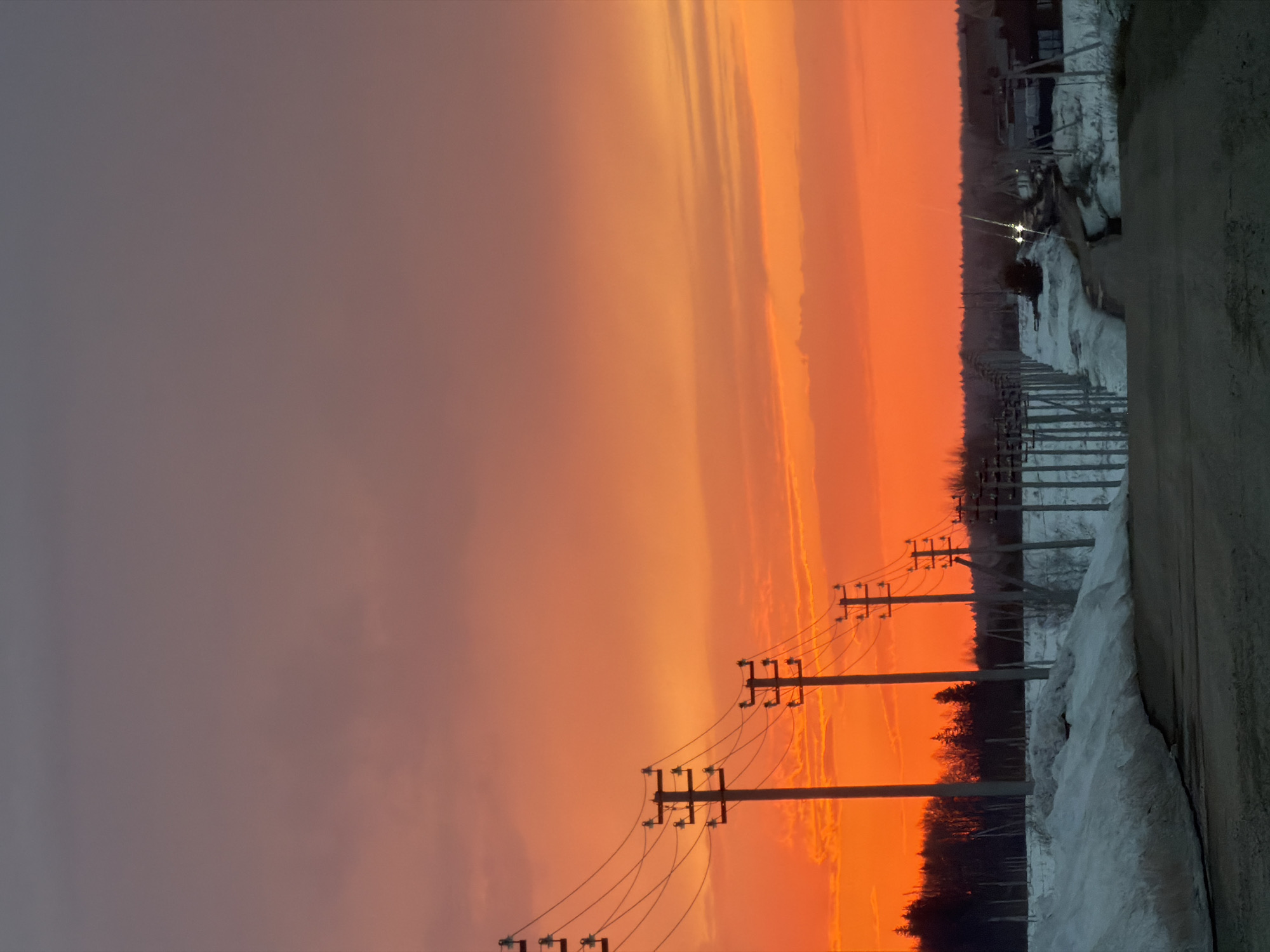 The image captures a vivid sunset in what appears to be a rural or suburban area. The sky transitions from a deep orange near the horizon to softer hues of orange and grey higher up. Silhouetted against the vibrant sky are a line of utility poles with power lines stretching between them. The right side of the image shows a snow-covered area alongside what looks like a road or path. In the background, faint lights suggest the presence of buildings or a settlement. The image is taken at an angle, possibly from a moving vehicle or handheld device. While identifying the exact location within Izhevsk, Russia is challenging without more specific visual cues, the scene suggests a periphery area of the city where residential zones meet open land.