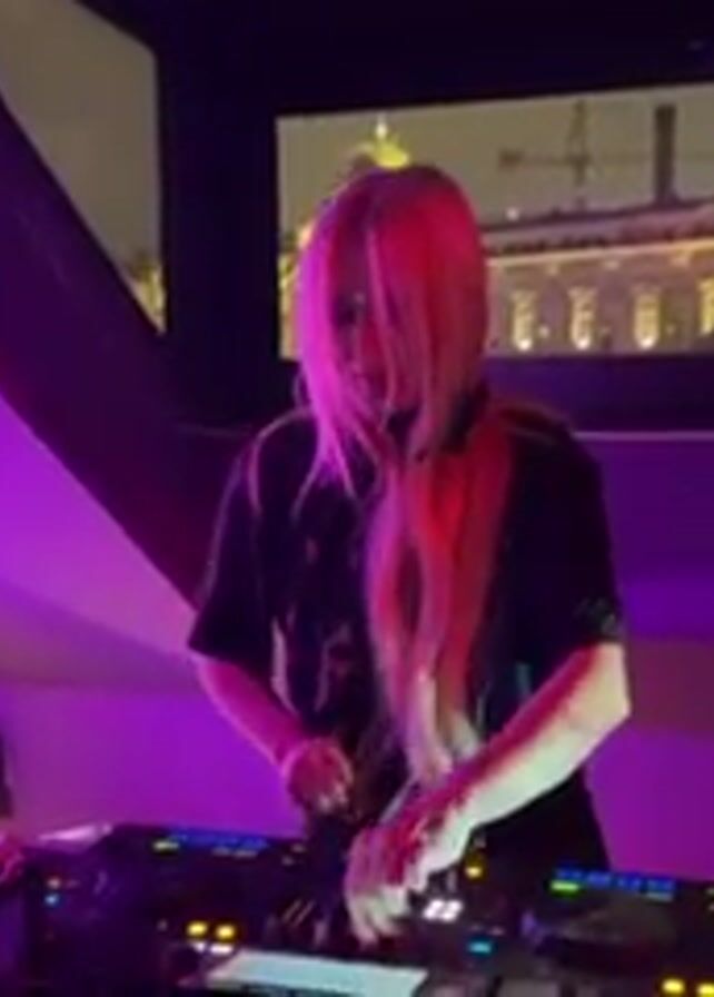 A female DJ with long blonde hair is actively mixing music on a DJ setup, consisting of decks and a mixer, in a room with purple lighting