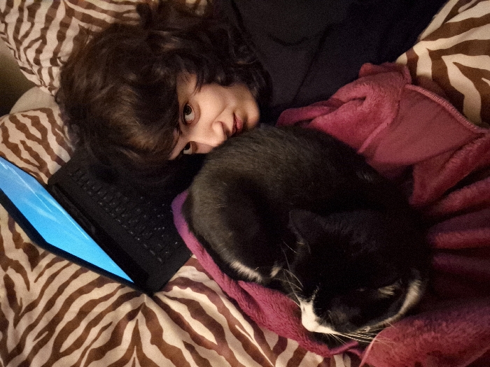 An indoor scene in Châtelaillon-Plage, France, depicts a young female and a cat resting on a bed. A female individual, with dark, wavy hair, is partially visible on the right side of the frame, looking directly towards the viewer. She is wearing a dark, long-sleeved garment. To her left, a black laptop computer is open with its screen displaying a bright blue interface; it rests on the bedding. A black and white cat is curled up on a magenta fleece blanket, positioned between the female and the laptop. The cat's white snout and whiskers are visible. The bed is covered with brown and white zebra-print bedding. The environment appears to be an interior space, likely a bedroom, under soft illumination.