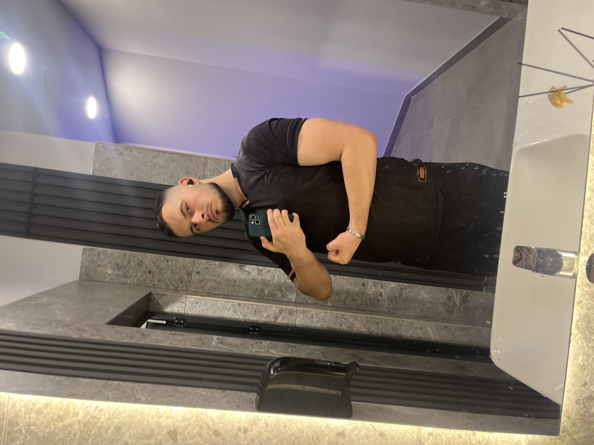 A man is posing for a selfie in a bathroom, potentially located in Burgas, Bulgaria. He is wearing a black t-shirt and black shorts. The bathroom features gray marble tiles on the walls, a horizontal striped design beneath the mirror, and bright lighting. A soap dispenser is visible beneath the mirror. The background includes a light-colored ceiling and wall with recessed lighting.