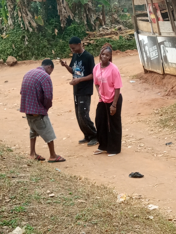 Three individuals stand on a dirt path. On the left, a person in a plaid shirt and cutoff jean shorts, facing away from the camera. A young man in a black shirt holds a phone, and a young woman in a pink shirt and black pants stands to his right. A small, dark object sits on the ground near the edge of the path. In the background, lush greenery contrasts with a structure adorned with advertisements. The dirt path is surrounded by grass.