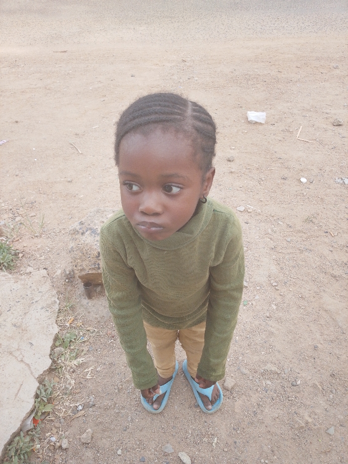 A young, dark-skinned girl stands in an outdoor setting. She wears a green, high-necked sweater, tan pants, and blue flip-flops. Her hair is braided. She gazes to the left with a contemplative expression. The ground is dirt and gravel, with some scattered debris and small patches of weeds. A concrete curb is visible on the left edge.