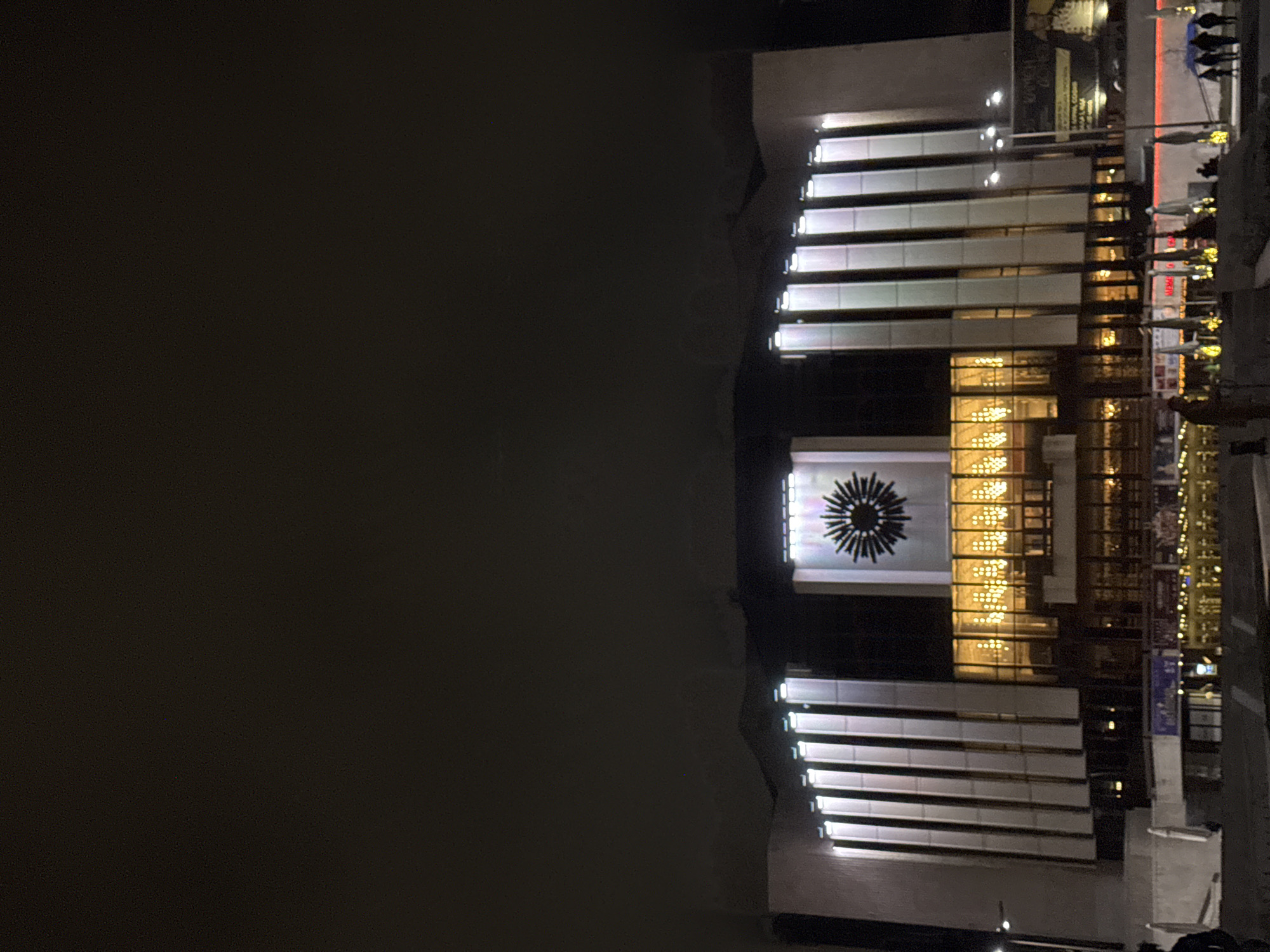 The image depicts the National Palace of Culture in Sofia, Bulgaria, at night. The building is lit up, with a prominent, spoked decorative feature on its facade. Several people are visible along the sidewalk in front of the building. The surrounding environment appears to be a cityscape at nighttime.