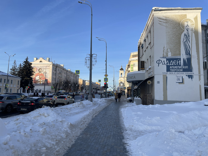 A winter street scene shows a snow-covered sidewalk and roadside. Cars are lined along the road. Buildings flank both sides of the street. On the building to the right, a mural depicts a religious figure with Cyrillic text. A church tower rises in the distance. A pedestrian crossing is visible with a red traffic light. The sky is a clear, bright blue.