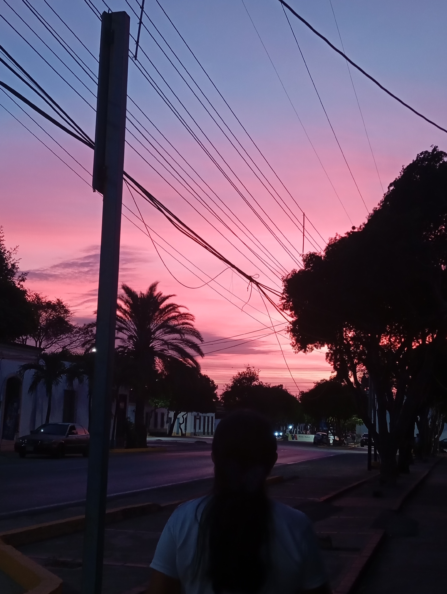 street scene in Tacarigua, Venezuela at dusk. The sky is a vibrant mix of pink and blue, with numerous power lines stretching across the frame. A utility pole is visible on the left. Silhouetted trees line the street, and in the distance, other buildings are visible. A person, facing away from the camera, is in the foreground wearing a light-colored shirt. A car is parked along the street. The road is illuminated by streetlights.