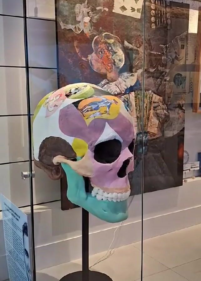 glass display case in what appears to be a museum or art gallery. Inside the case is a colorful, decorated skull mounted on a black stand. The skull is primarily white, pink, and teal, with various shapes and images painted on its surface. Behind the skull, on the wall, are two framed pieces of art with abstract and collage-like designs. Other framed items and small objects are visible on a shelf below the artwork. The room has white walls and appears brightly lit. A person's voice is audible in the background.