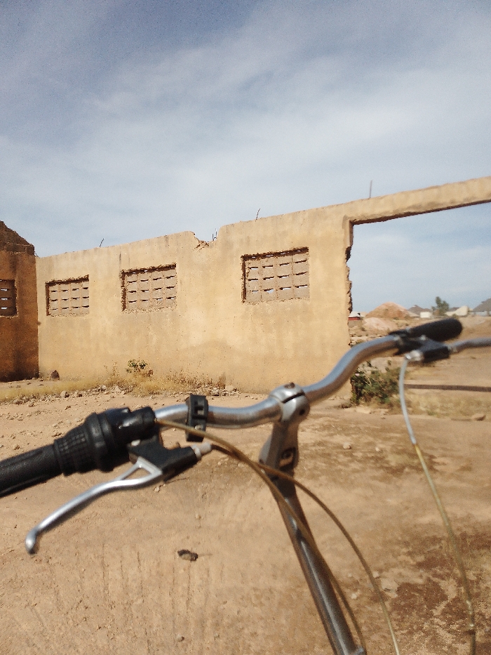 The image depicts the view from behind the handlebars of a silver-colored bicycle, positioned on dry, reddish-brown earth. In the midground, a damaged, light brown, single-story wall structure stands under a partially cloudy blue sky. The wall features at least three rectangular window openings, each containing a horizontal concrete block or grate pattern. The top edge of the wall is uneven and damaged, with exposed rebar visible in places. To the right, a large rectangular opening in the wall, possibly a doorway, reveals distant piles of reddish earth and faint structures in the background. No individuals are present in the scene. The location is Katon Rikkos, Nigeria.