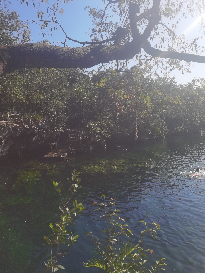 body of water with a tree branch extending over it, a small platform in the water, and some greenery along the shore. The water is clear and appears to be a cenote. There are a few people swimming in the water. The location is a cenote in San José, Mexico. The coordinates 20.492, -87.258 place the location near a cenote called "Cenote Dos Ojos."