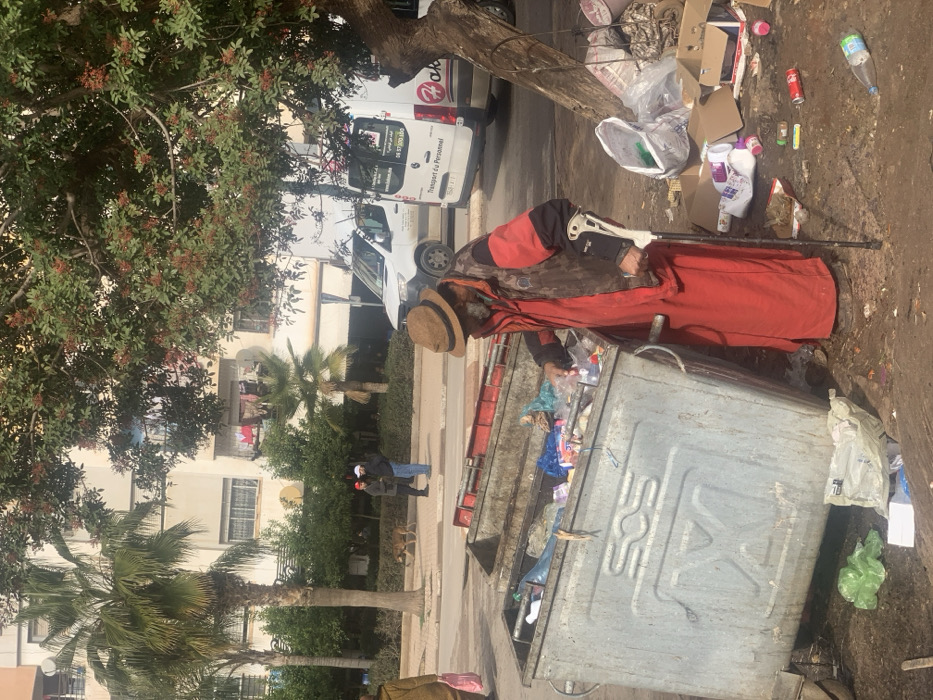 This image captures a daytime urban street scene in Ouislane, Morocco. In the foreground, an older man with a dark beard and a brown fedora is depicted engaging with a large, grey metal dumpster, leaning into it with his left hand. He wears a long red robe (djellaba), a red long-sleeved shirt, and a brown vest, and supports himself with a black and white forearm crutch held in his right hand. The dumpster, tilted slightly, is overflowing with various items of trash including plastic bags, bottles, and general refuse. A second similar dumpster is visible immediately behind it. The ground around the dumpsters is heavily littered with plastic bottles, cans, cardboard boxes, and other debris. To the right of the man, the trunk and leafy branches of a tree with small red berries partially frame the scene. Across a paved street in the midground, multiple light-colored, multi-story residential buildings are visible, featuring balconies with clothes drying and satellite dishes. The street is lined with palm trees and other green foliage. Two white vans, one marked "Transport du Personnel" and "Haka Services," are parked on the street. In the background on the far side of the street, two individuals are seen standing, one wearing a red cap, with a dog nearby. A third person is partially visible walking on the far left of the frame.