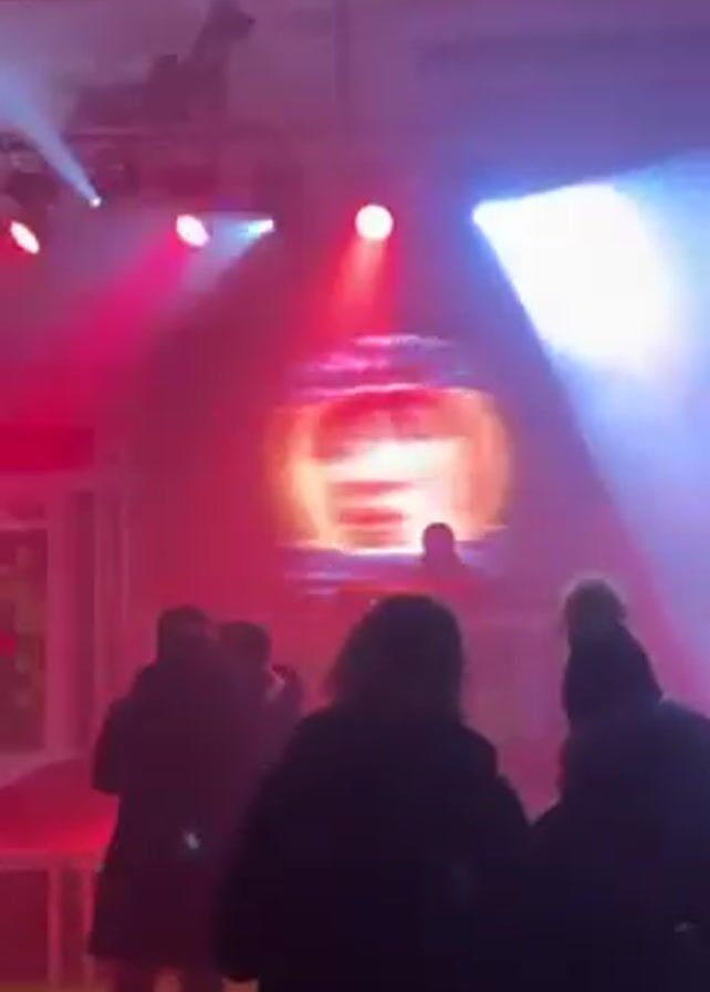 concert or party with a large screen displaying "JACQUES" in front of a DJ booth. Several people are in the audience, mostly silhouetted in the dim light. The lighting is a mix of red, white, and blue, creating a party atmosphere. The camera then focuses on a man wearing a black puffer jacket over a yellow hoodie and a blue hat. He throws several small yellow foam objects into the air, appearing to be having fun. The background suggests the event is taking place in a large, open space, possibly a stadium or venue with high ceilings.