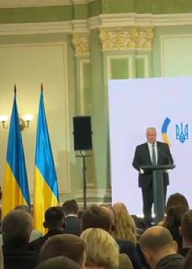 A medium shot depicts an event indoors. A man in a suit stands at a podium, addressing a seated audience. The man is light-skinned with gray hair, and he is facing the crowd with a serious expression. Behind him is a large screen with the image of the Ukrainian flag and the Ukrainian coat of arms. To the left of the screen are two Ukrainian flags displayed on flagpoles. The room is decorated with ornate architectural details, including detailed crown molding. The audience is composed of many people dressed in formal attire, who are seated and attentively listening to the speaker. A single speaker is visible on the left. The camera angle is from the perspective of someone in the audience.