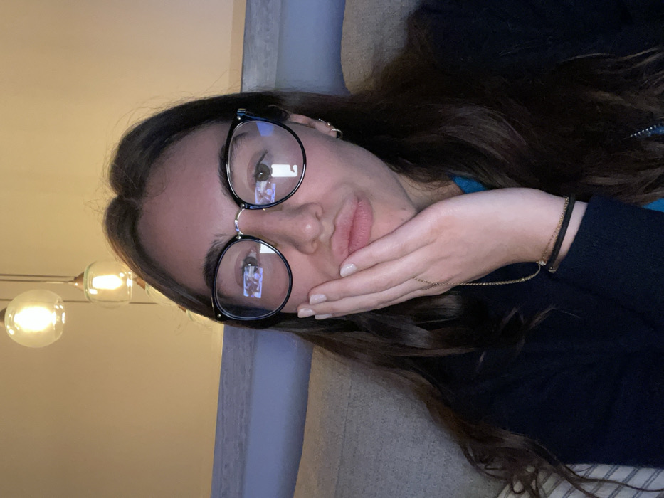 The scene depicts an individual indoors, described as occurring in Naucalpan de Juárez, Mexico, though visual evidence within the image is insufficient to confirm this specific geographic location. **People:** One individual, a female with long, dark brown hair, is positioned in the foreground, facing directly towards the camera. She wears large, dark-rimmed circular glasses. Her expression features pursed lips in a pout, with her right hand resting against her right cheek and chin. Her fingernails are painted a light, neutral color. **Subjects/Objects:** The individual is wearing a dark garment, possibly a sweater or jacket, over a teal or blue undershirt. A thin gold-colored chain necklace is visible, draped over her right hand. On her left wrist, two thin bracelets are present: one dark-colored and one gold-colored. Reflections in her glasses show indistinct light sources and shapes, suggesting a screen or additional lighting in front of her. In the background, two pendant light fixtures with clear glass globes and illuminated filaments are suspended from the ceiling. A light-colored wall is visible behind the lights. A portion of a gray, upholstered sofa or seating unit is visible on the left and bottom of the frame. **Actions/Interactions:** The individual maintains direct eye contact with the camera, posing with a pouting expression and her hand positioned on her face. The image appears to be a selfie. **Environment:** The setting is an interior room, characterized by warm artificial lighting from the pendant fixtures. A light-colored wall and a gray upholstered furniture piece suggest a domestic or residential environment. The overall lighting is dim, highlighting the individual and the light sources.